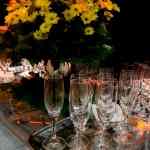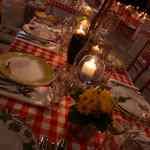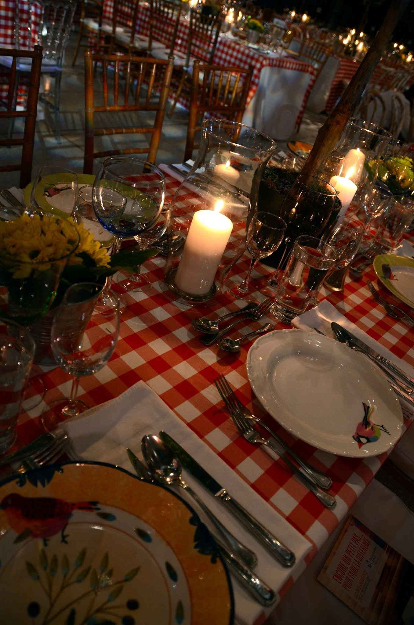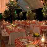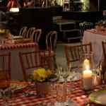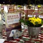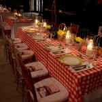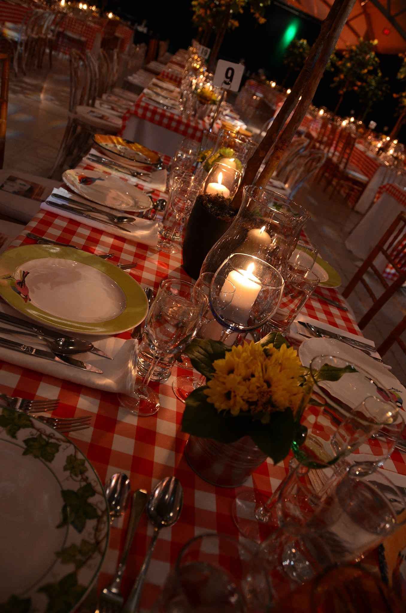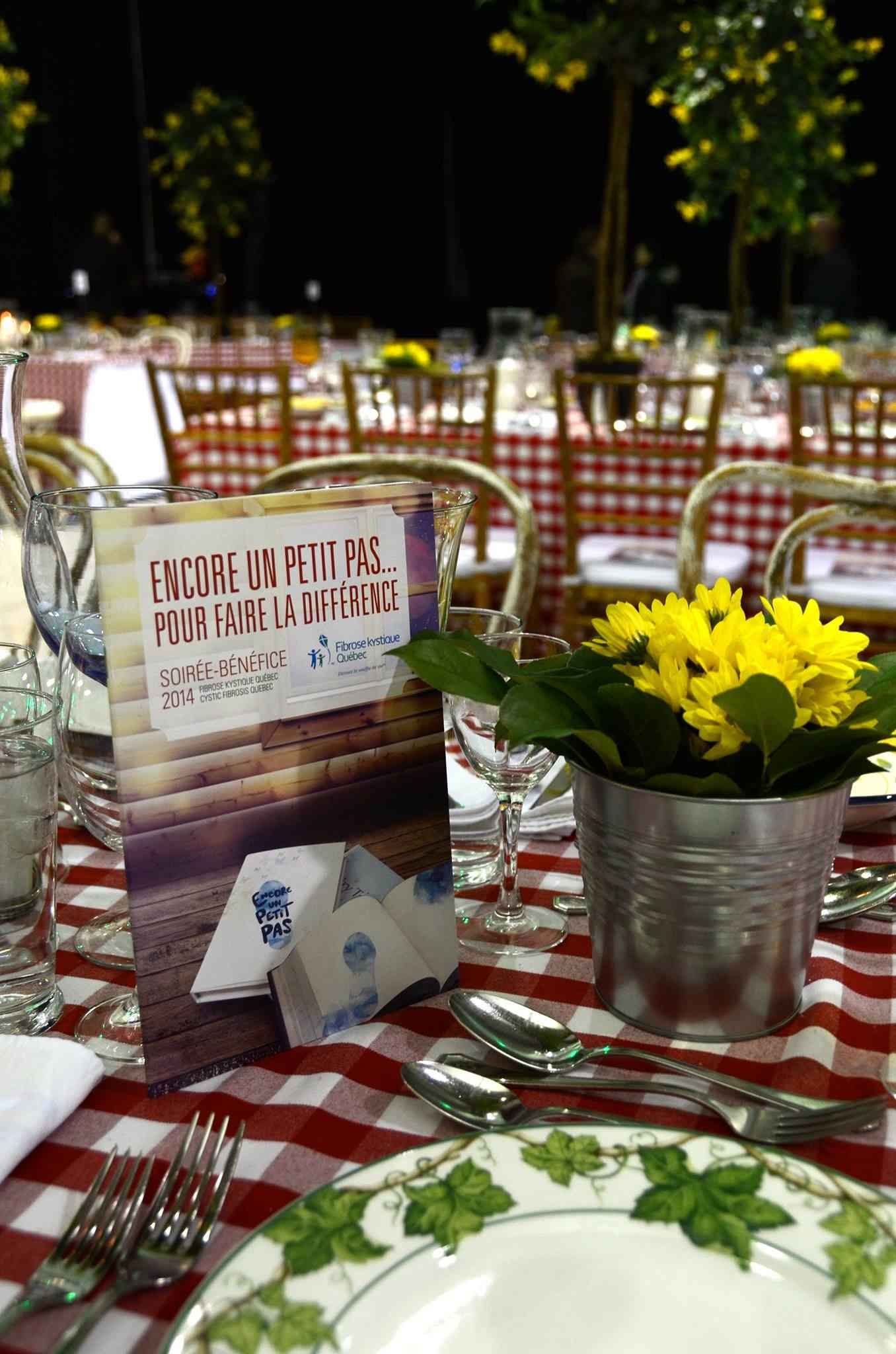 Les centres de table sont composés d’arbres symbolisant l’érablière ainsi que de bougies de type pilier protégées par des photophores. Les tables rectangulaires de 2,10m x 90cm (7’x 35″) sont recouvertes de nappes à carreaux rouge et blanc. Le mélange de chaises de type bistro décolorées et de chaises transparentes avec une assise blanche donne une impression de “chic urbain”. La table est complétée avec un doux mélange de nos ensembles de vaisselle Pomme verte, Vignoble, Christina et Provence. La verrerie est un magnifique amalgame de nos gobelets Ambre, pourpre et bleu.