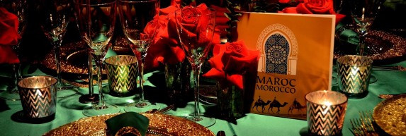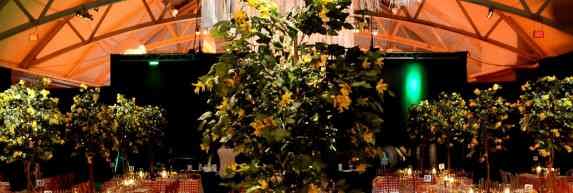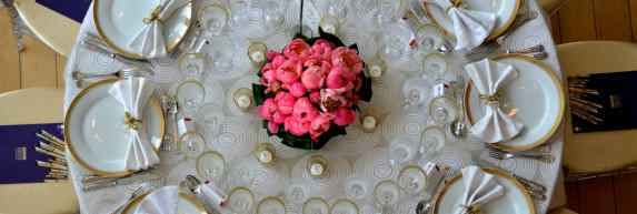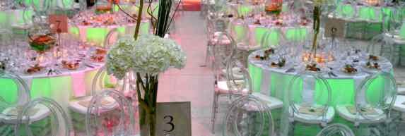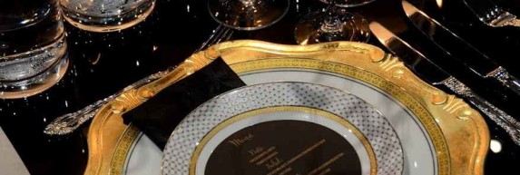 What sparks the imagination & inspiration to achieve the perfect late-night after party hang out. Tailored tables, soft focus lighting, romanticism, flamboyant cluster of suspended flower arrangements, deep rich black chairs and plexiglass table top. Details: Gold charger, gold trimmed plates, si...