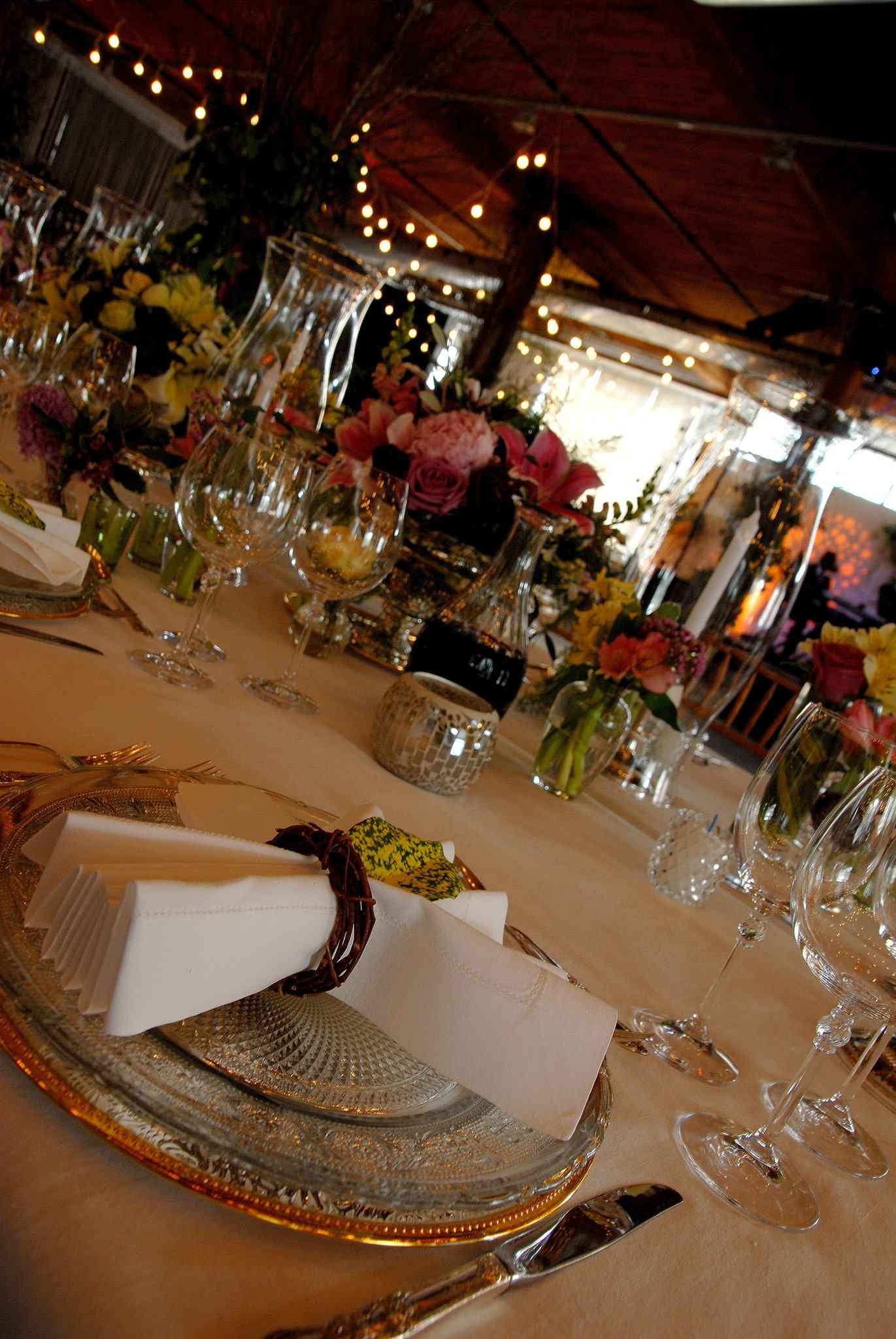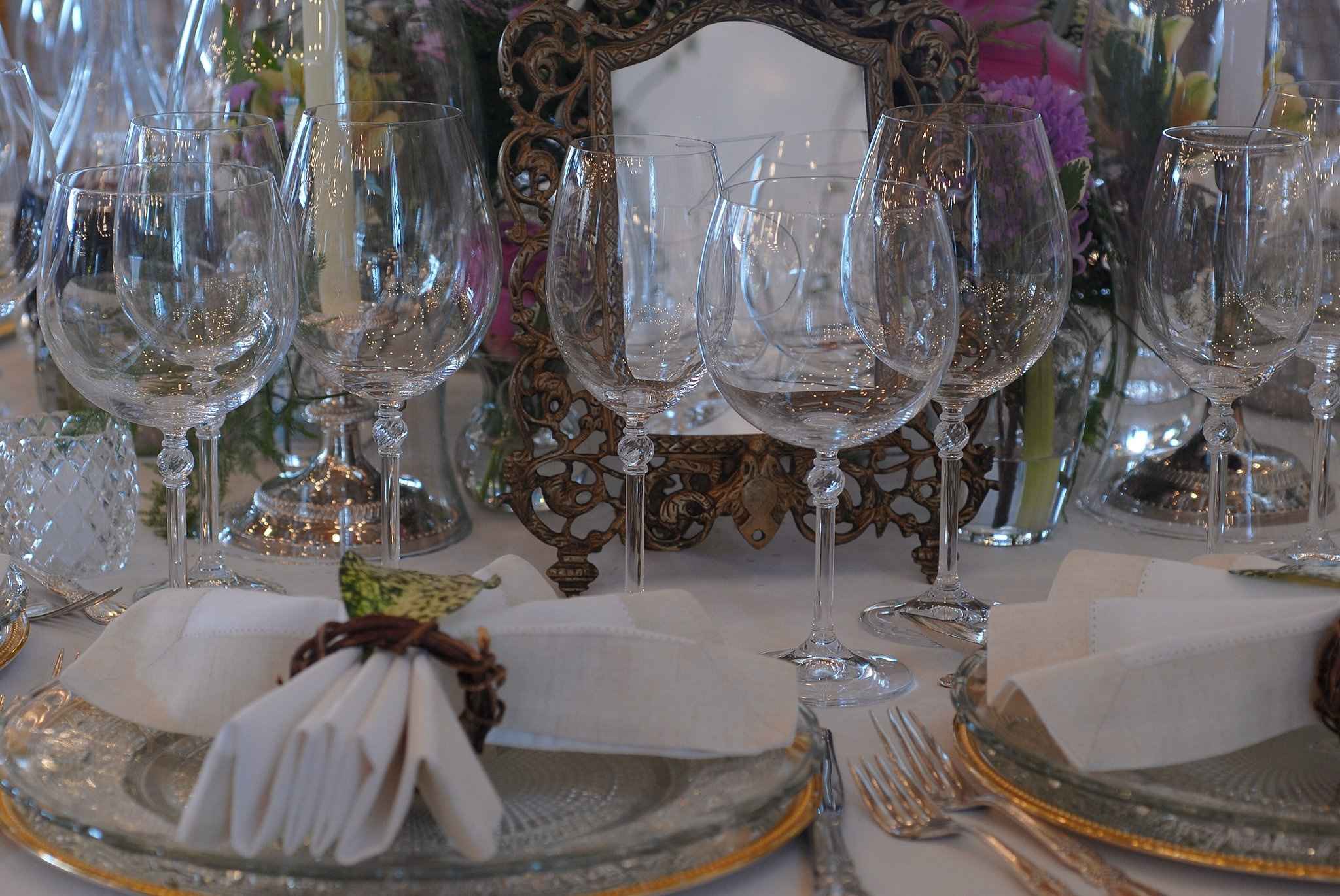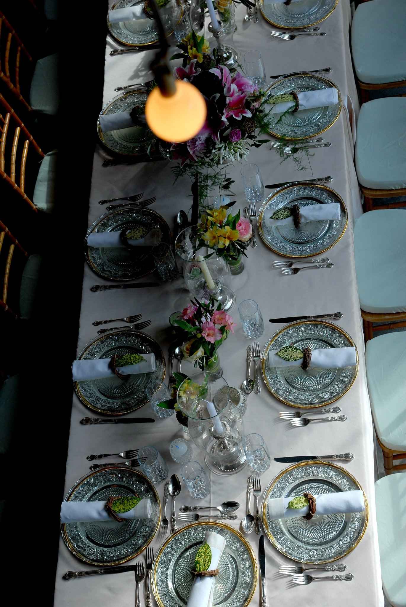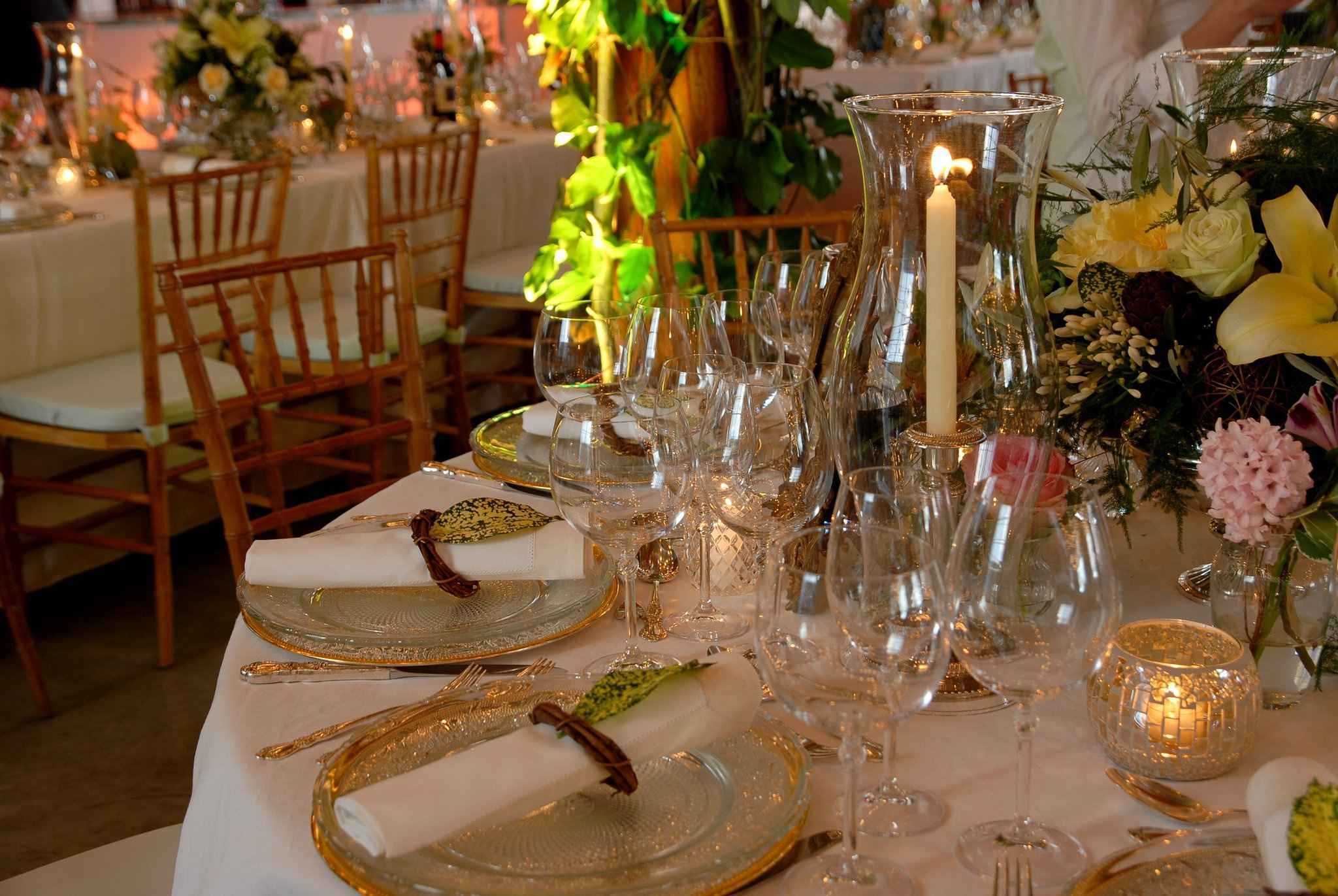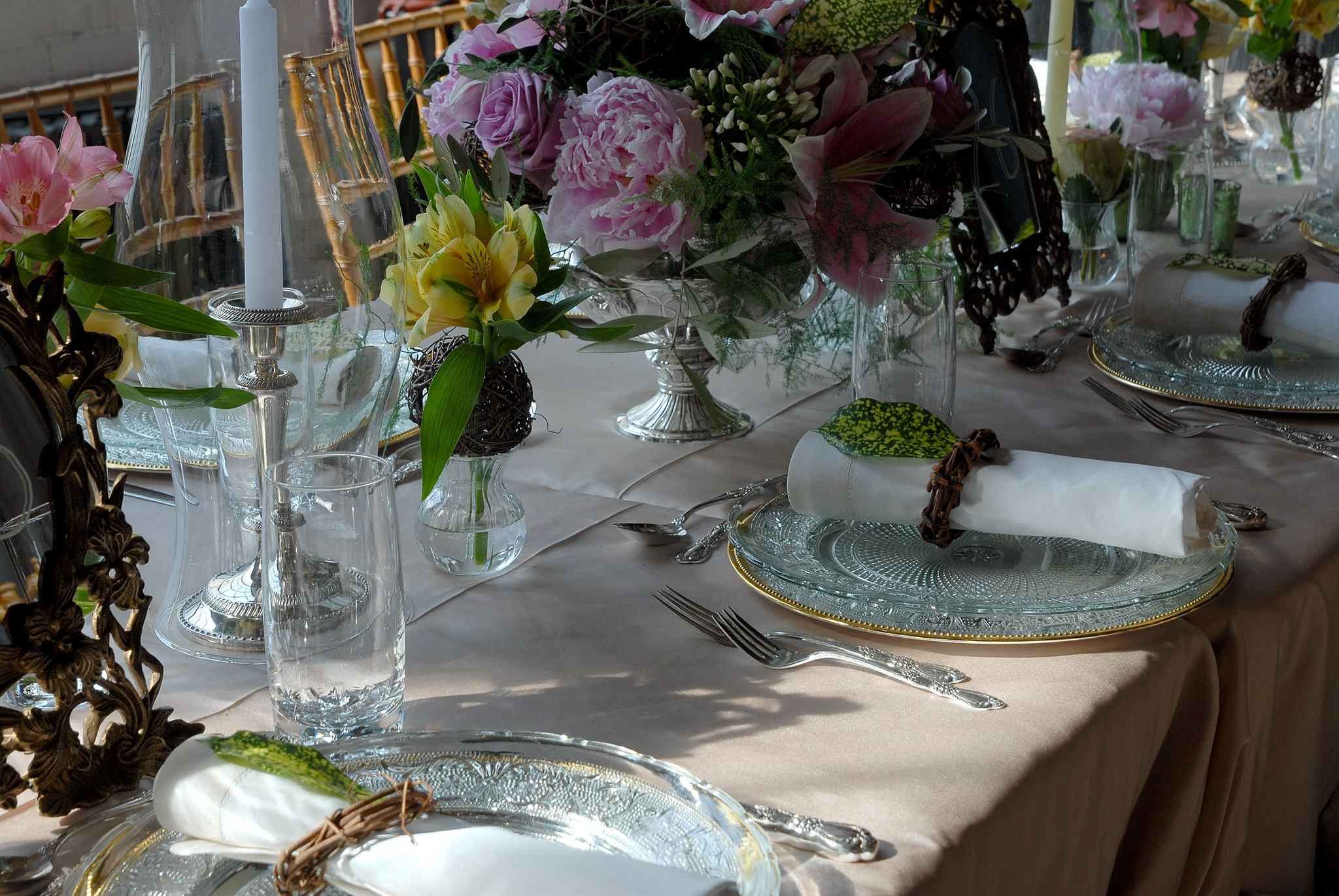 Products : Mixed round and rectangular tables topped with a white visa, bottom burlap “café au lait”. Service plate silver gold trimmed with trellis glass chargers, Bohemia glasses, Victorian silver bowl, oar Versailles chairs with mint cushions. Hurricane with silver plated candlestick, silver plated cutlery, Versailles napkins, metro satin band and wine bottle decanters.