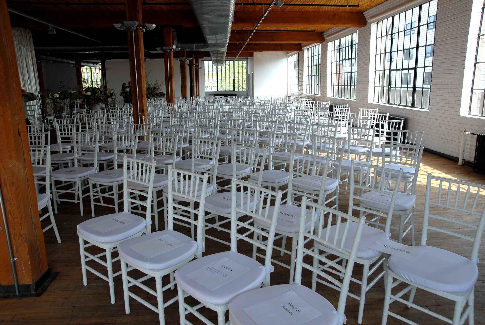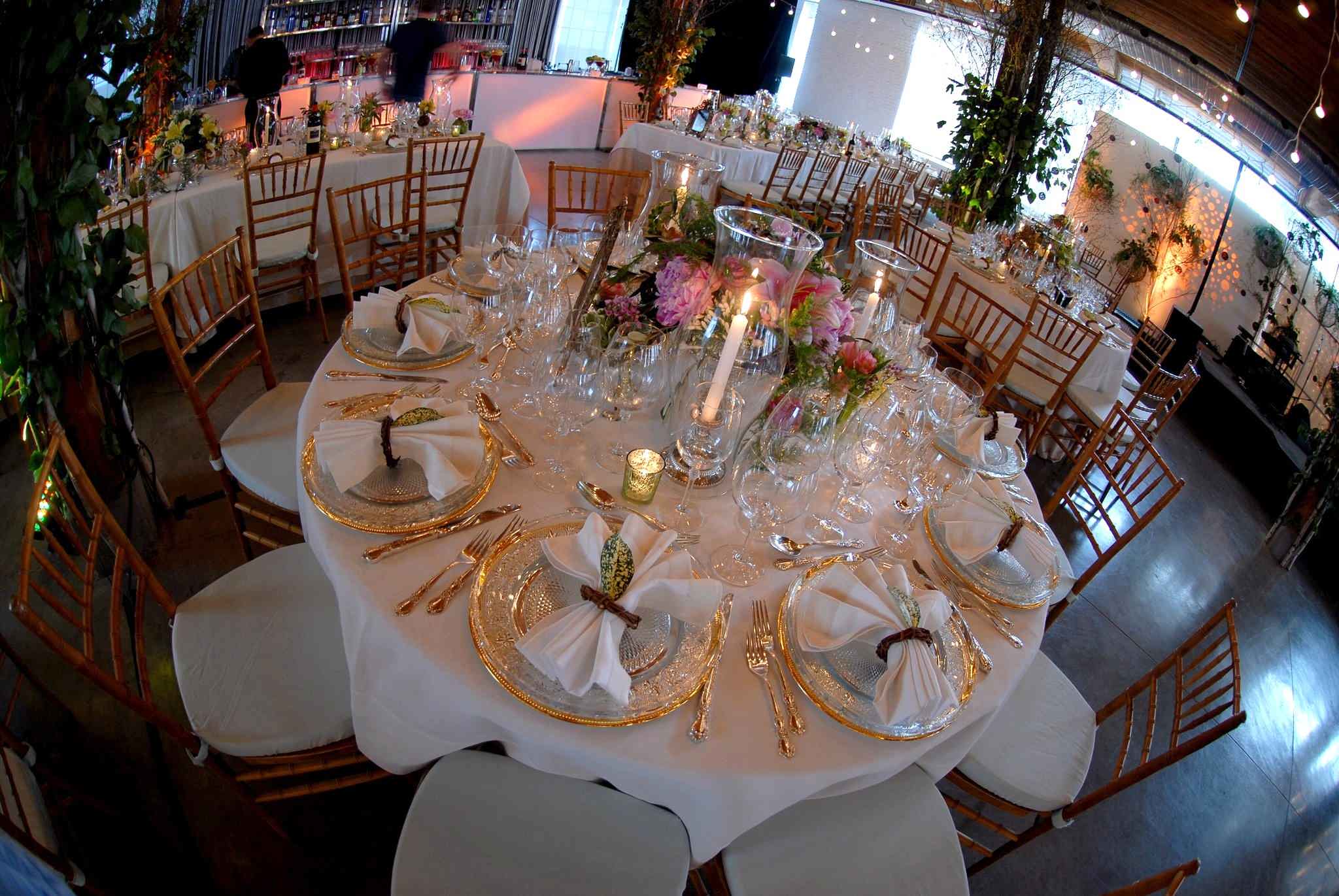 The coordinator was asked to bring an outdoor garden inside. The base was already established by renting the Parisian Laundry. Exposed brick walls with rounded windows, exposed wood ceiling and old wood floors.
