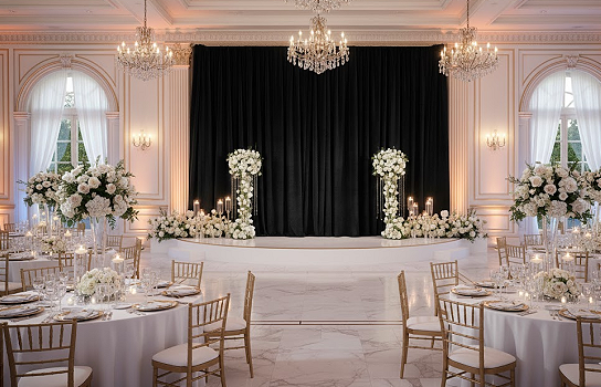 Elevate your event with our luxurious black velvet draping. Its rich texture and dramatic hue provide a perfect backdrop for galas, weddings, or corporate events. Ideal for draping walls, stages, or ceilings, it adds an elegant touch to any setting.