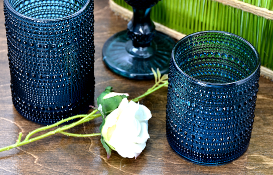 For your event rentals, choose the stunning Jupiter Lowball Glass Blue Dot 10.5 Oz. With its generous capacity, this glass is perfect for serving a variety of drinks, from refreshing cocktails to chilled water, at all your special occasions.