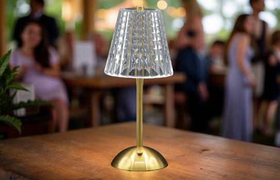 Enhance your event décor with the refined glow of our Élégante Gold Bistro Lamp – 10", battery operated. Designed with a graceful silhouette and a luxurious gold finish, this compact lamp brings sophistication and warmth to any table setting. Ideal for weddings, gala dinners, and upscale receptions, it offers the perfect balance of elegance and practicality — no cords needed.