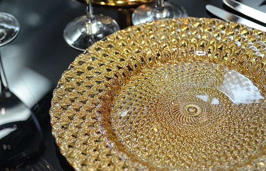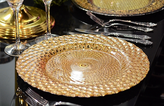 Enhance your table with the Service Plate Glass Starburst in Gold. Measuring 13 inches, this elegant plate features a striking starburst design that adds sophistication to any event. Perfect for upscale dining and special occasions.
