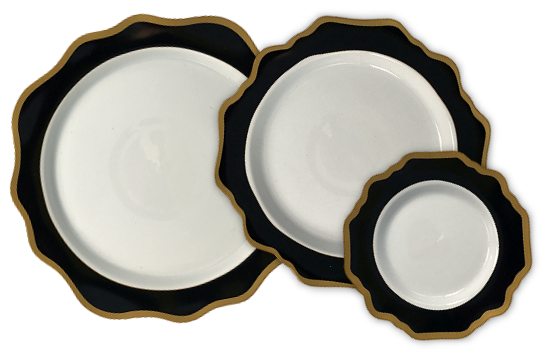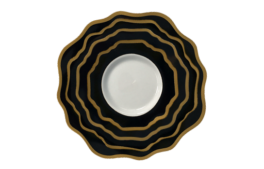 The Royal Flower Black Service Plate with Gold Rim offers a sophisticated base for your dining experience. Perfect for upscale events, its elegant black finish with a gold rim elevates any formal setting.